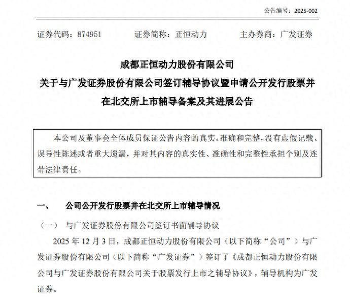微成都报道近日,新三板基础层挂牌公司成都正恒动力股份有限公司(简称“正恒动力”)公告称,已获四川证监局上市辅导备案登记,正式启动北京证券交易所IPO进程,辅导机构为广发证券。