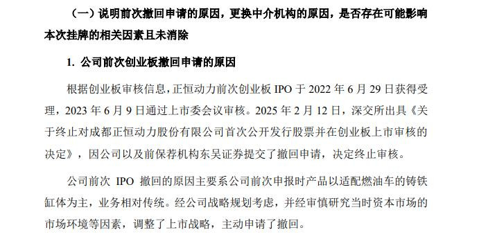据正恒动力此前披露,撤回原因主要系公司前次申报时产品以适配燃油车的铸铁缸体为主,业务相对传统。经公司战略规划考虑,并经审慎研究当时资本市场的市场环境等因素,调整了上市战略,主动申请了撤回。