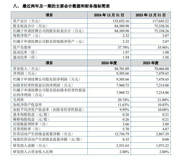 财务数据显示,公司营收规模持续扩大。2023年度、2024年度,公司营业收入分别为7.05亿元、8.87亿元;净利润分别为7478.65万元、9305.66万元。